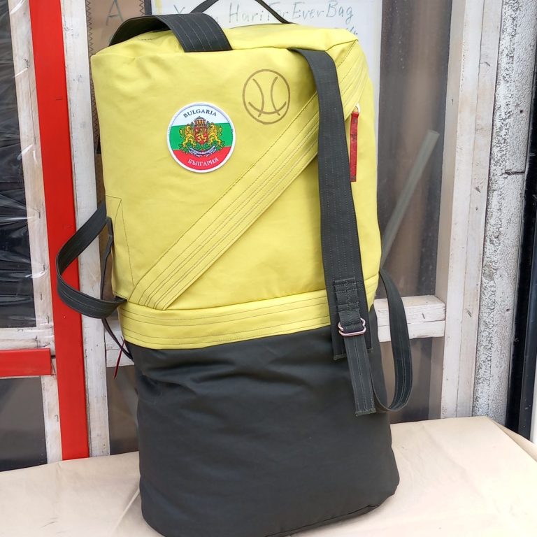 Wasserdichter (IP 64) Rucksack mit einfaltbarem, separatem Helm-Fach, Vollzwirn-Baumwolle, Hauptfach weiß gefüttert, Größe L kurz, Maße: 60 cm*36 cm*24 cm. Volumen: 44,4 Liter.