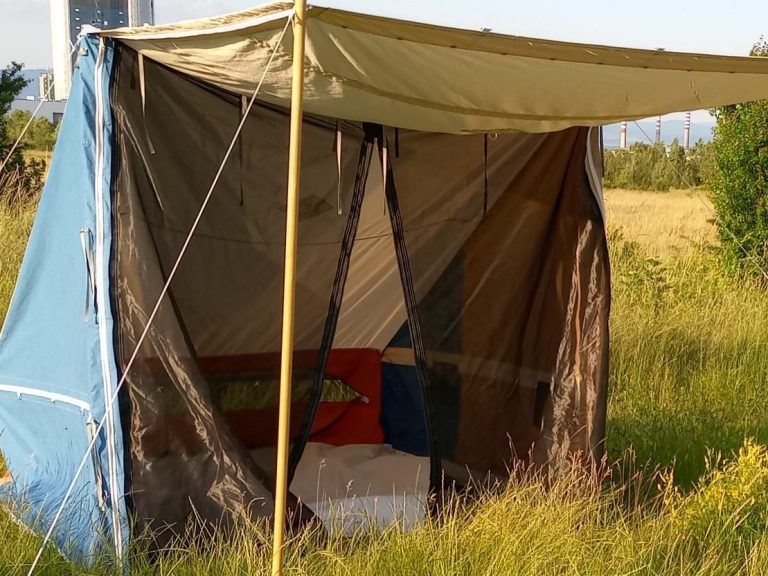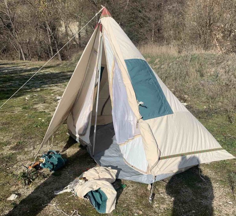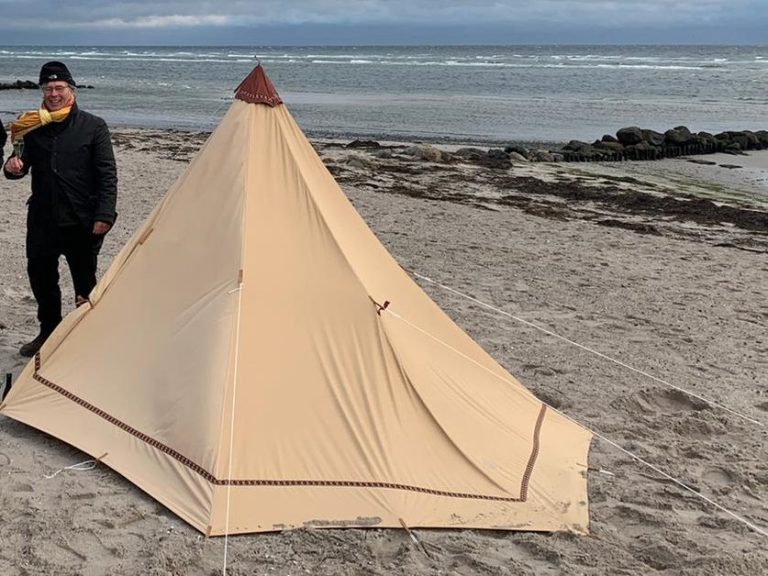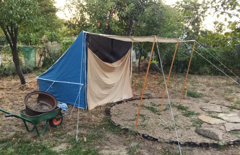 Ein Qualitätszelt, dunkel und trocken gelagert, nur 3 Male für drei Wochen aufgebaut, ist auch nach 15 Jahren Jahren noch in bestem Zustand. Dieses Haritipi ist wurde aus einem alten Familienzelt in Tunnel-Form (4,60 m * 3,30 m * 2,05 m, Gewicht 25,5 kg) geschneidert. Maße des Hari-Upcycling-Tipis: 3,20 m Durchmesser, 2,15 Höhe. Gewicht ca. 7 kg.