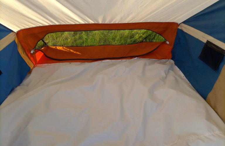 Von innen bedienbare Moskitonetz- Lüftung mit Zwei-Wege-Reißverschluß. Die Lüftung befindet sich absolut regensicher unter der rückwärtigen Traufe.